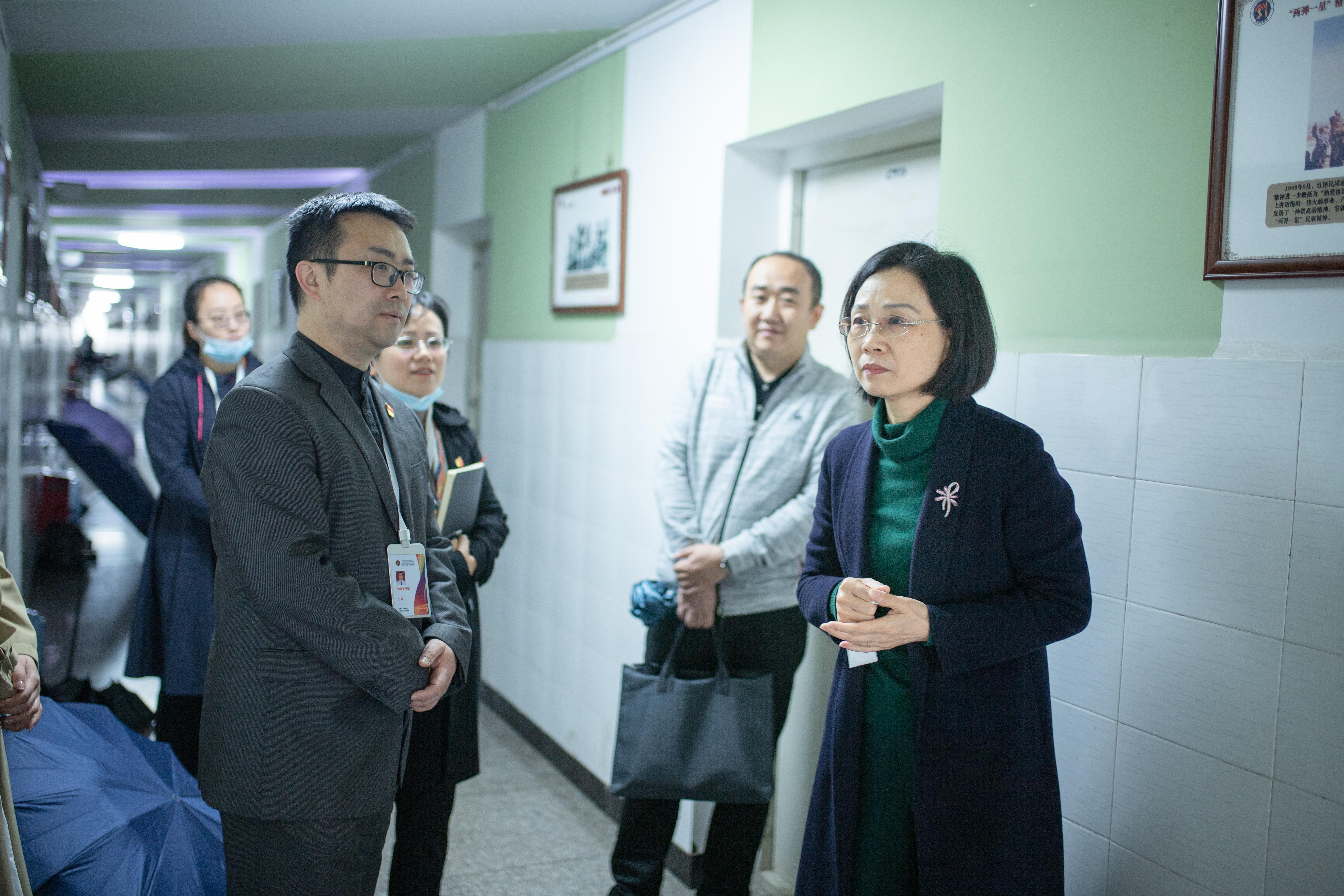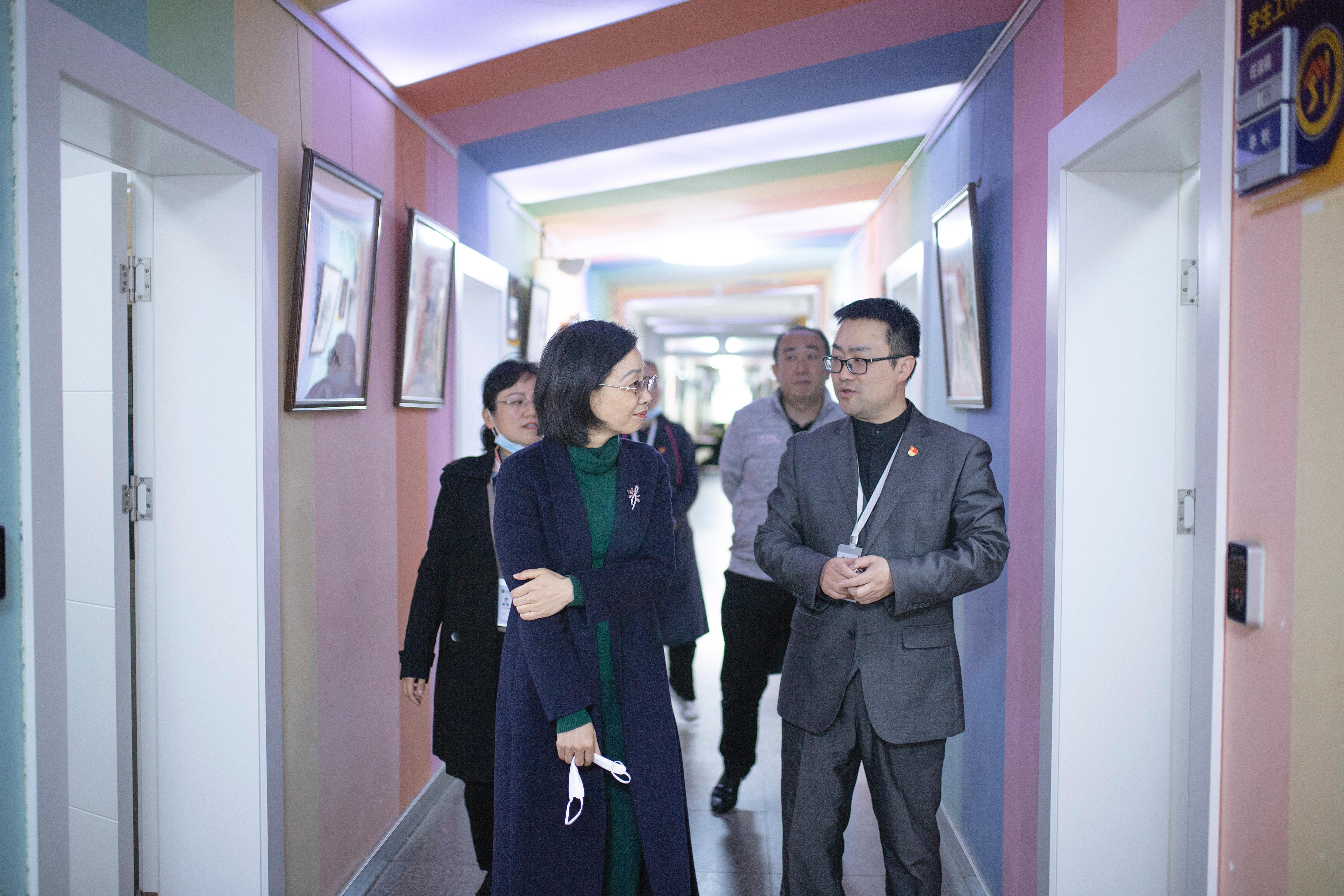 杨爱华副书记一行从一楼审美走廊开始,向学院甘霖书记详细了解了唐臣书院分别以党建、科技、心理健康、唐臣精神、国学为内涵的各楼层主题走廊设置以及党员课堂、科创空间、心灵家园、唐臣学堂、孔子学堂、唐臣文化驿站等公共区域的使用情况,对唐臣书院“一站式”服务管理和“六横一纵”环境育人的整体设计表示赞赏,对走廊照明灯亮度这一细节提出建议,希望可以保持宿舍走廊常明常亮,减少因灯光亮度不足对同学心理造成的影响。