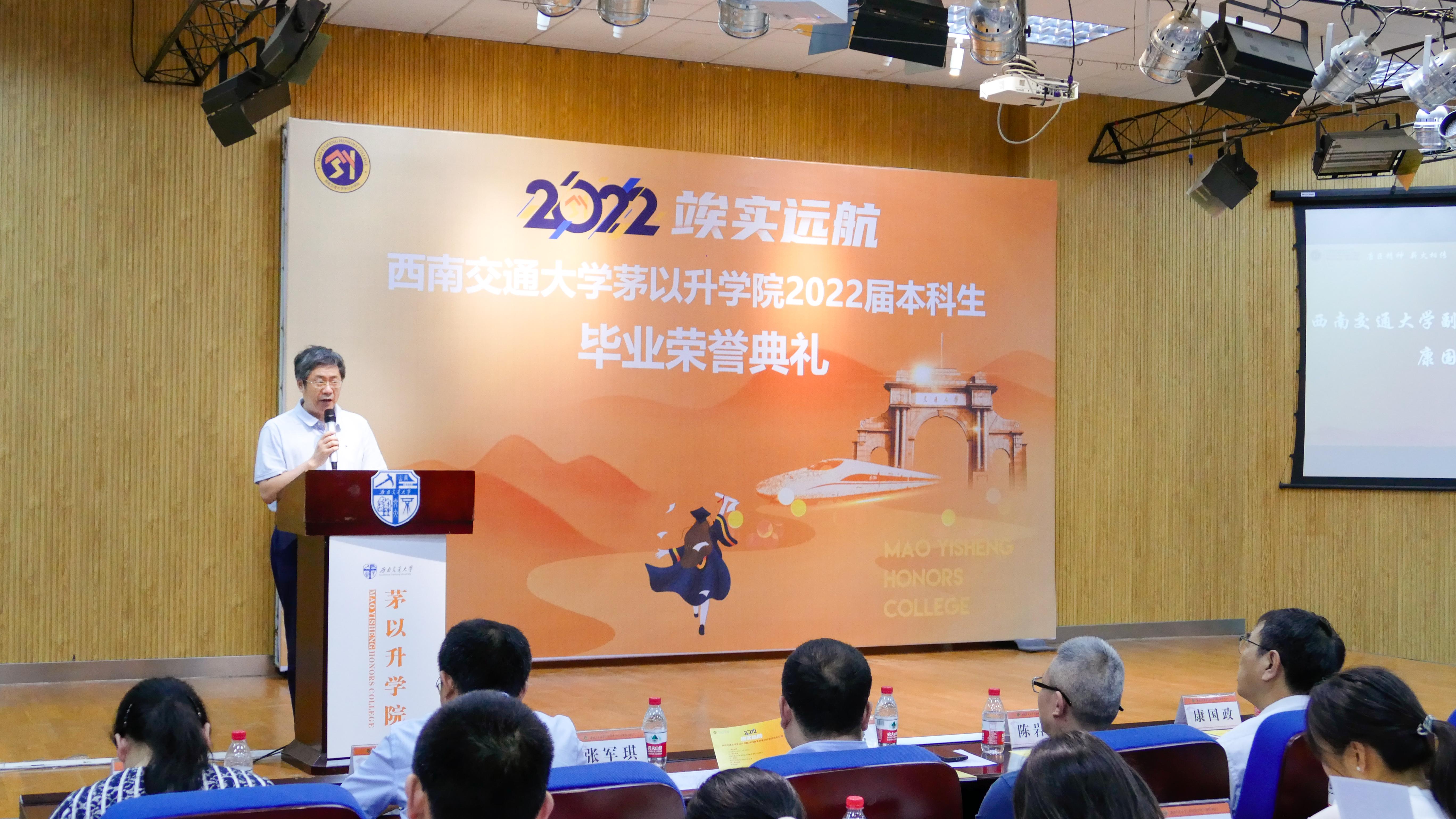 首先由康国政院长为典礼致辞,他以“奋斗青春,逐梦未来”为题,向全体毕业生寄予了殷切期望:希望同学们传承竢实扬华、自强不息的交大精神,秉持“求实创新、卓尔乐群”的茅院院训,用奋斗点亮青春,用拼搏创造荣光,用专业知识服务社会,在肩负时代重任中追求卓越,在扎根基层奉献中实现自身价值,踏歌而行,逐梦未来。同时提出“用矢志报国赋能‘起跑动力’” “用实干笃行保持‘持久定力’”“用推陈出新提速‘冲刺能力’”三点要求激励同学们把握历史发展大势,扎根中国大地、对接世界前沿、服务人类发展,在实践学习、自主创新、开放合作中尽情展现交大人的青春力量。