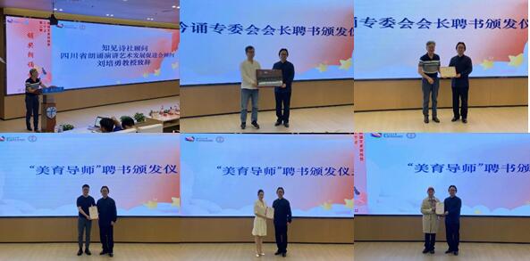 宋彧会长向唐臣书院颁发四川省朗诵演讲艺术发展促进会“吟诵专业委员会会长单位”牌匾,甘霖书记向省朗演促进会颁发“美育实践教学基地”牌匾。由刘培勇教授为甘霖书记颁发吟诵专委会会长聘书,为孟涵老师等颁发吟诵专委会委员聘书,由甘霖书记为文艺家秦刚先生等颁发“美育导师”聘书。