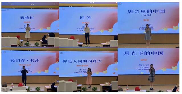 颁奖朗诵会上,获奖选手们分别表演了《在山那边》《沁园春•长沙》《唐诗里的中国》《月光下的中国》《最后一分钟》等蕴藉中华民族文化精神的经典诗文朗诵。知见诗社朗诵家李俊文老师和知见诗社诗人李婷婷老师声情并茂、情景交融地进行示范表演,朗诵《石壕吏》《大运神话》。