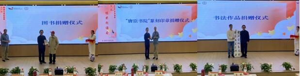 颁奖结束后,文艺家秦刚先生代表四川省地方志工作办公室向书院捐赠图书和诗文集,文艺家尧箴先生向书院捐赠“唐臣书院”篆刻印章,书法家陈荣仲先生向书院捐赠书法作品,甘霖书记向各捐赠代表颁发收藏证书。