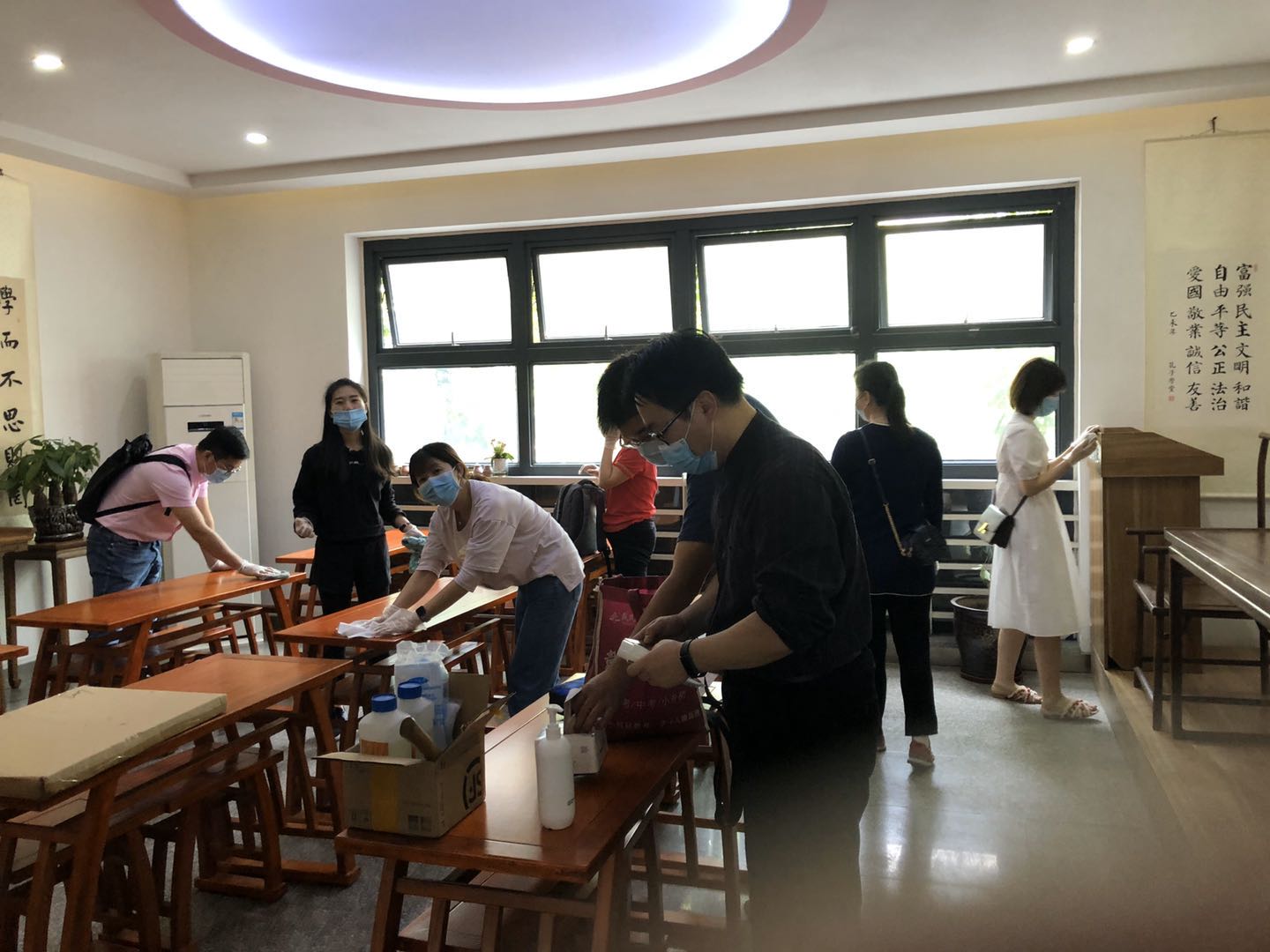 下午2:30,学院全体教工党员带着清洁工具走进书院,分别对唐臣书院各楼层公共区域进行统一清洁打扫,对书院内设施进行仔细检查,包括已重新更换布置桌椅的“孔子学堂”“唐臣学堂”,以及四楼、五楼读书阅览厅,六楼“党建走廊”,各层茶水间等;同时对各楼层主题走廊挂画进行了布置和更换,为迎接第一批茅院学子返校做好准备。