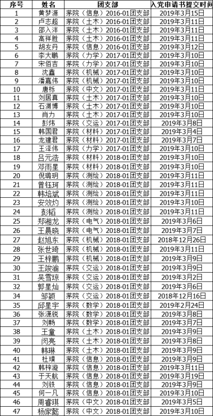 为进一步做好入党积极分子培养发展工作,增强党员发展工作的民主程度和透明度,广泛接受群众监督,保证党员发展的质量,按91九色 党总支要求,特将2018-2019学年第二学期的入党申请人名单公示如下: