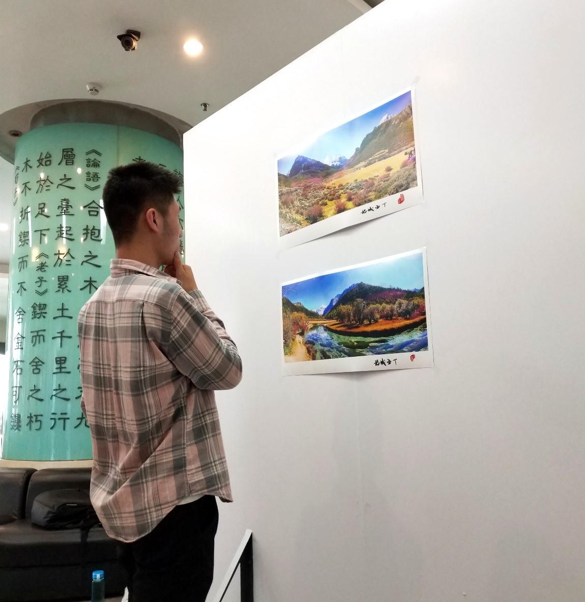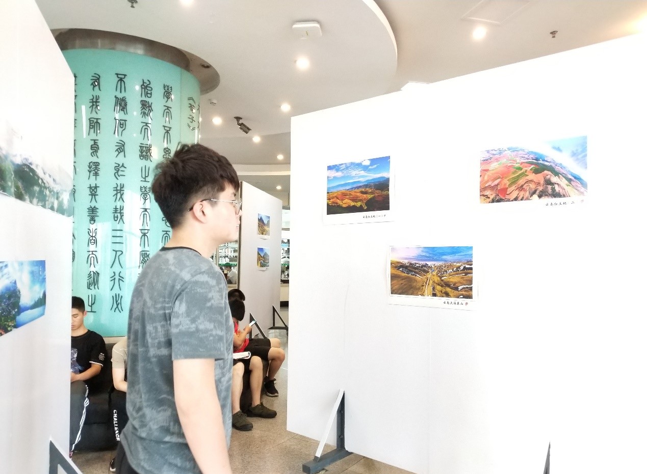 宽敞的大厅中,有序地摆放着陈大建老师的七十幅摄影作品,其中,不乏关于我国河山以及著名景点的作品,包括四川紫平湖、云南九龙瀑布、藏地、新疆博斯腾湖、凤凰古城、稻城亚丁等的作品。壮丽的风光再加上精湛的摄影技术,陈老师的摄影展给我们一场妙不可言的视觉盛宴。另外,展板上还有人文关怀的作品,以及我们交大的俯瞰图,同志们伫立在交大俯瞰图前,惊叹于俯瞰交大时竟是如此一番美景。