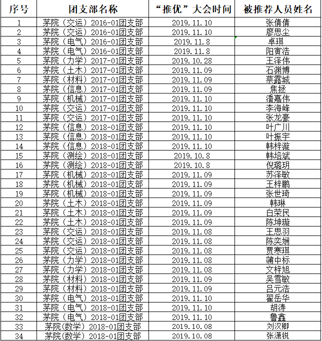 共青团组织积极向党组织推荐优秀团员青年作入党积极分子是“党建带团建,团建促党建”工作的重要切入点,是党对共青团提出的具体要求,也是共青团作为党的助手和后备军的具体体现。为使“推优”工作规范化、透明化、公开化,特将2019-02期“推优”名单公示如下: