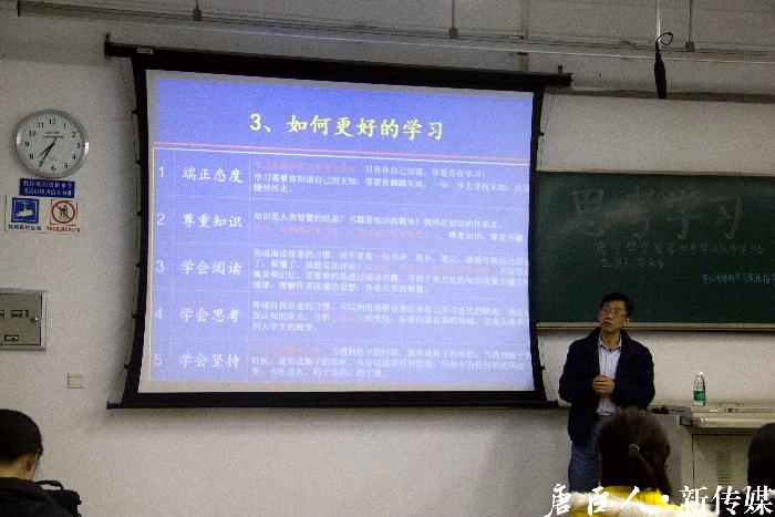 学习会伊始,郭老师向同学们分享了他的学习经历,并向同学们提问:“如何看待学习?在未来四年该如何适应大学的学习生活?”
