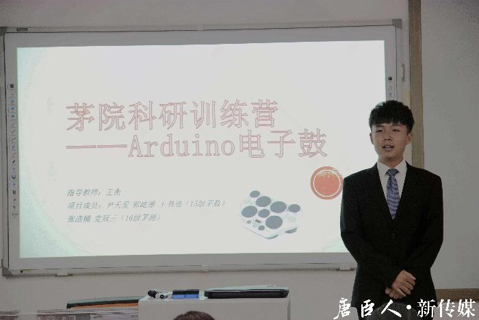第四小组上台展示,他们的科研项目为“茅以升科研训练营—Arduino电子鼓”,由张浩楠同学进行介绍。5名成员计划设计一个不需深入学习就能人人使用的电子鼓,通过敲击鼓面由振动传感器传输信号并发出各种各样的声音。老师们建议尤其注意振动传感器和鼓面的结合问题,这对最终的声音效果有着很大的影响。