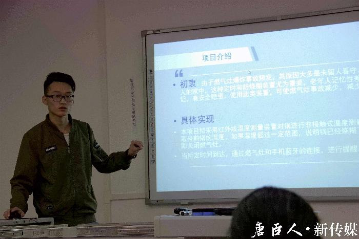 最后的第七小组的张立中同学向大家介绍了他们的科研项目“燃气灶定时和防烧糊装置”。三位成员构想设计一个防烧糊装置,可以定时断电也可以通过温度监测断电,可以监测烧水,煮饭,炒菜等各种情况。老师建议对于温度这一指标要加以改进,可能温度的高低并不能很好地反应饭菜是否烧糊。