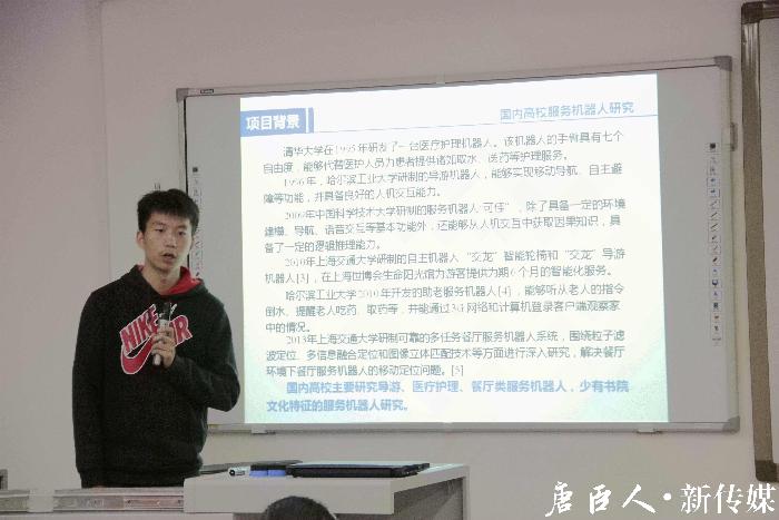 会议开始,主持人简短介绍后第一小组开始答辩。他们的科研项目是“‘唐臣人’卡通机器人设计”,由湛博同学进行答辩。小组共有两名成员,他们构想设计一个有简单语音交互系统的机器人为茅院同学提供便利。在老师提问环节,老师们建议要明确服务的程度,实现人—机器人—环境的良性互动。