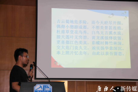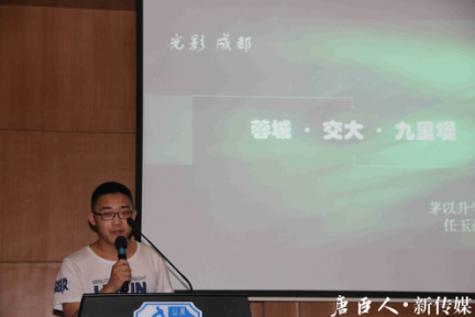 场上观众对李佳蔓老师的致辞报以热烈掌声。随后,比赛进入第一个环节——“我与摄影”。每位参赛者依次登台,阐明自己对比赛主题的理解,讲述作品故事。第一位选手,来自地球科学与环境工程学院的王博轩展现了一组题为“最爱蜀地行不足”的组图,并用自创的七言古体诗述说了图片故事。第二位选手何非同样来自地球科学与工程学院,他以一个浙江人的角度,观察蓉城的独特。阡陌巷弄里的生活气息、历史悠久的三人麻将都给他留下了难忘的记忆。来自建筑与设计学院的唐程璇从专业角度阐述了她所提交作品的构图方法。方法技巧之外,驻足都江堰鱼嘴的她也真切体会到了“逝者如斯夫,不舍昼夜”的精神内涵。第四位选手是来自91九色