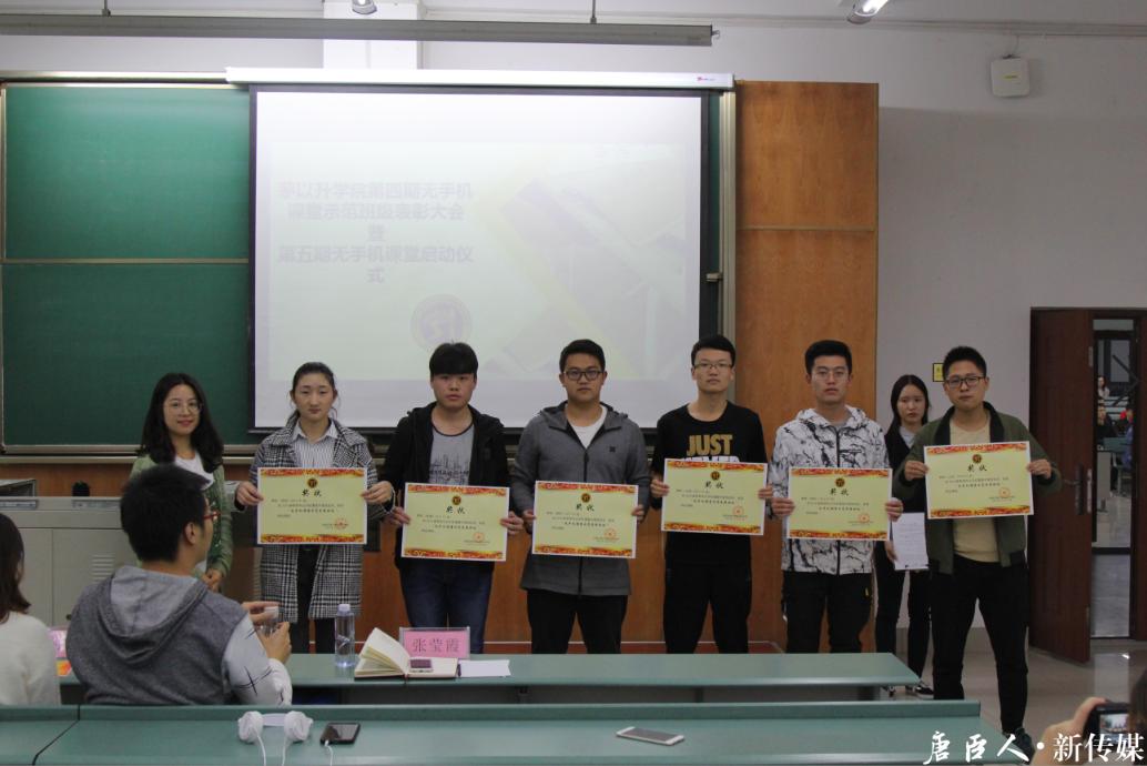 首先进行的是第四期 “无手机课堂”示范班级表彰环节,在第四期无手机课堂活动中,2015、2016、2017三个年级的多个班级积极参与申报,并在上学期期末圆满完成活动,同时也取得了较好的实践效果。根据申报数量和完成情况,共有9个班级荣获奖项。其中茅院(中文)2017-01班荣获无手机课堂优秀班级称号,茅院(土木)2017-01班、茅院(数学)2017-01班荣获无手机课堂模范班级称号,茅院(信息)2017-01班、茅院(力学)2017-01班、茅院(测绘)2017-01班、茅院(机械)2017-01班、茅院(土木)2016-01班、茅院(材料)2016-01班荣获无手机课堂先进班级称号,三位嘉宾老师依次为获得荣誉称号的班级颁发了奖状并合影留念。