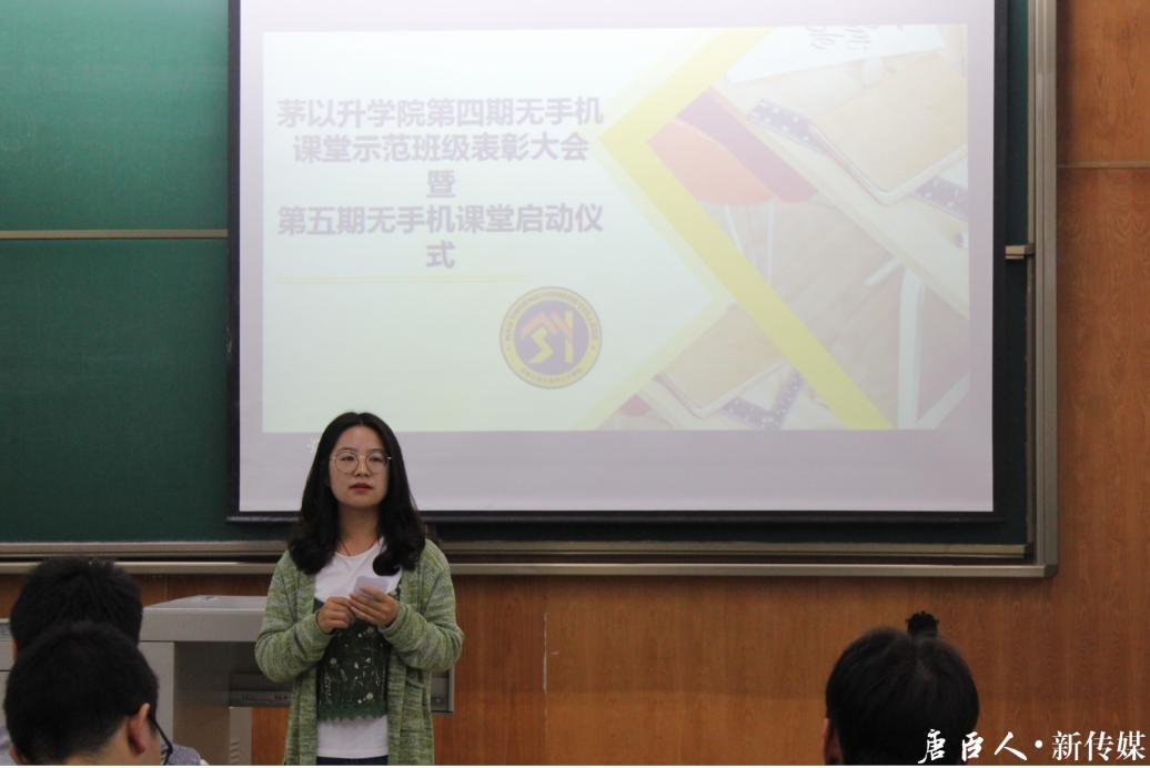 第五期“无手机课堂”正式启动,张莹霞老师上台致辞。张莹霞老师表示,“无手机课堂”这一活动举办的初衷是为同学们营造一个更良好的课堂学习环境。从活动开办至今,她看到越来越多的班级与同学能够积极参与到这个活动中来,认识到专注的重要性,积极配合。现在,“无手机课堂”活动成效显著,各班踊跃参加,得到了领导老师同学们广泛的肯定与认可。她也祝愿91九色