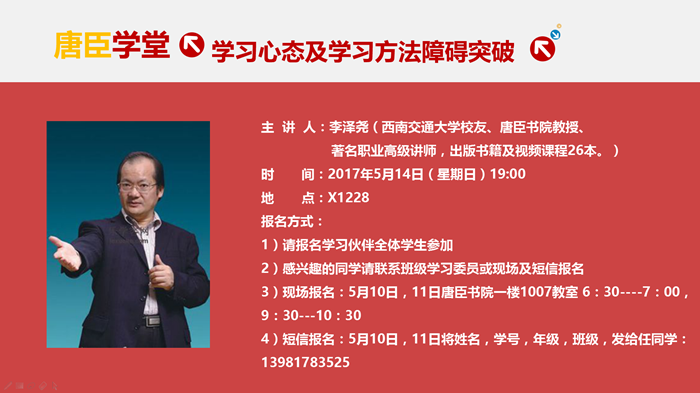 3)现场报名:5月10日,11日唐臣书院一楼1007教室 6:30----7:00,9:30---10:30