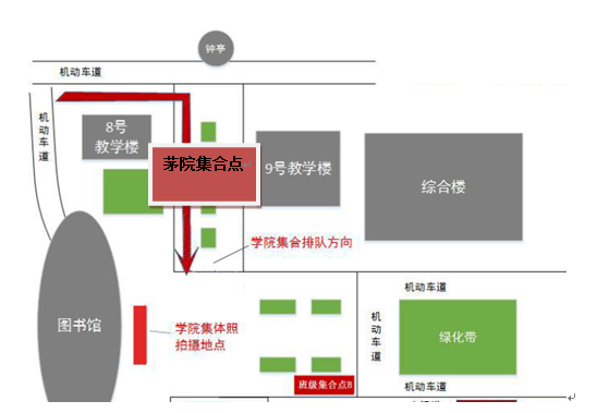一、 一、全体同学7点15分集合完毕,集合地点在8号教学楼和9号教学楼之间,如下图红色标示: