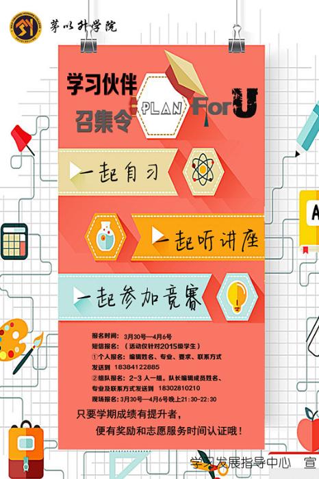 1、欢迎并鼓励同学们按照规则自行组成“学习伙伴”并向学习发展指导中心报备;