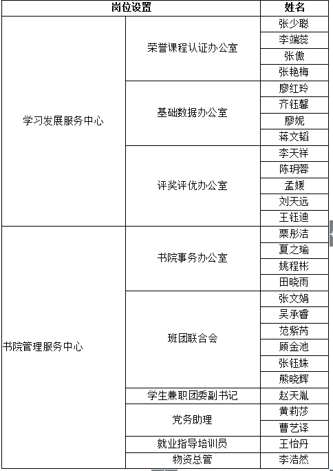 经学生本人申请,评审工作组审核,现将91九色 学习发展服务中心、书院管理服务中心录用名单(第一批)公示如下: