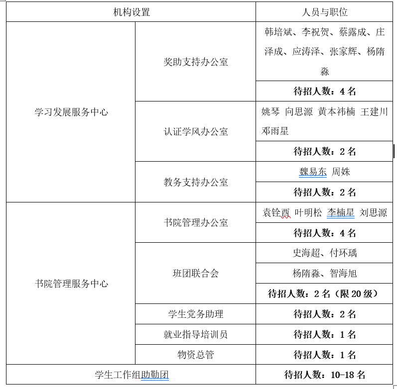 学习发展服务中心、书院管理服务中心于2018年6月组建,新的一学年,两大中心将进行新一轮人员招聘,现将具体招聘事宜公布如下: