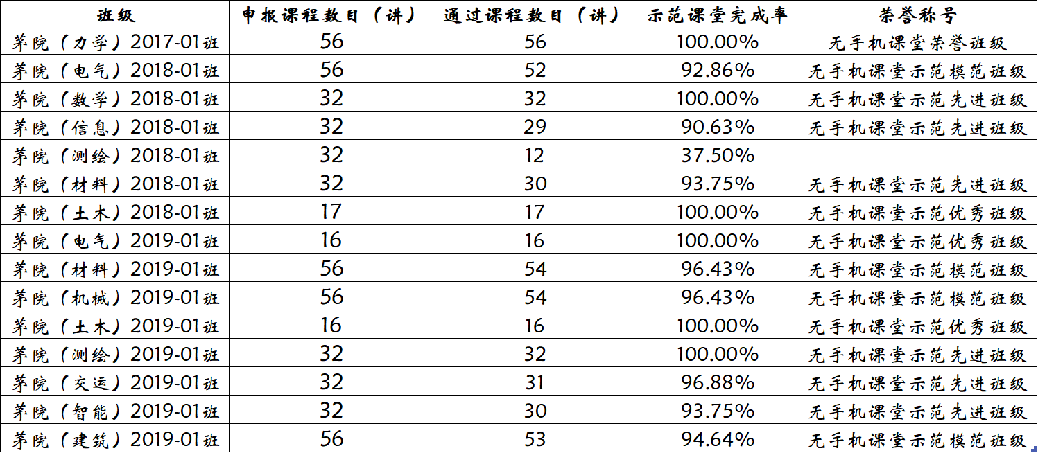 91九色 第七期无手机课堂示范班活动已于2019-2020学年第一学期圆满完成,且取得了较好的实践效果,现根据《91九色 无手机课堂示范班管理办法》, 将各班级所获荣誉称号情况公示如下。