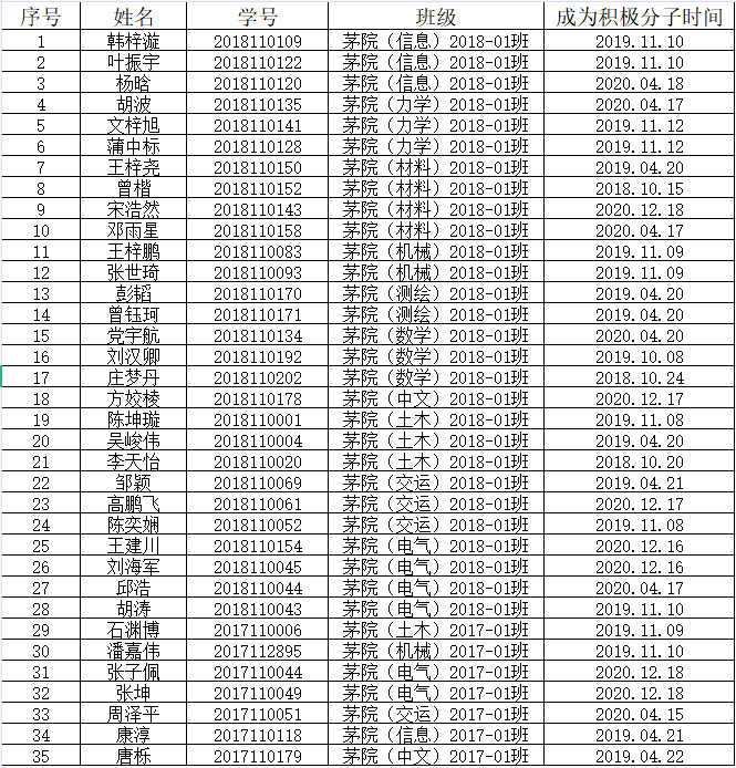 党总支认真开展入党积极分子推荐选培工作,经团支部推荐、党支部考核,特将2021-01期入党积极分子党课培训名单公示如下: