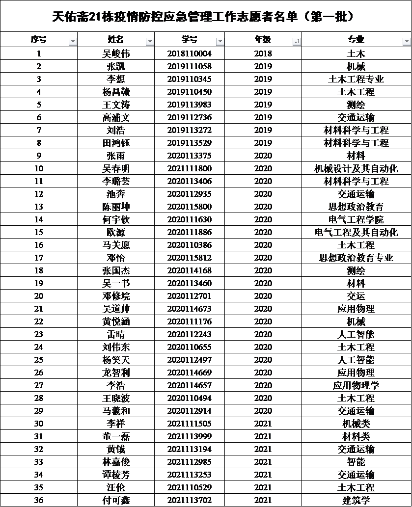 经学生本人申请,学院资格审核和选拔,现将2022年疫情防控应急管理工作志愿者录用名单公示如下。请录用同学尽快实名加入疫情防控应急管理工作志愿者QQ群聊:924475166,备注:年级+姓名,便于信息通知和交流。