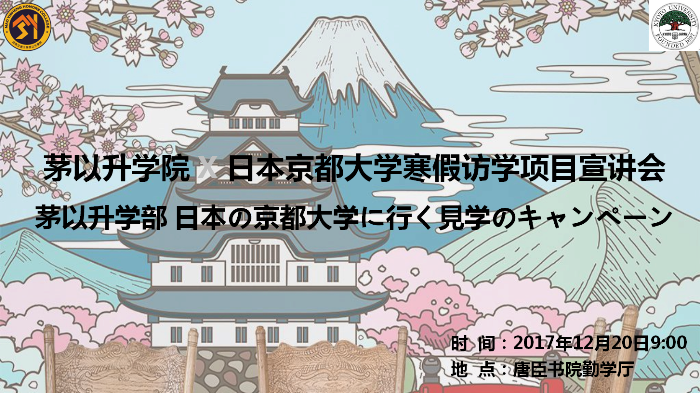 为保证本学期日本京都大学寒假访学项目的顺利进行,学院特此安排本次宣讲会为报名参与本次访学项目的同学介绍讲解项目具体行程并答疑解惑。