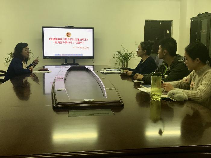 组织辅导员在X1122会议室学习《普通高等学校辅导员队伍建设规定》(教育部令43号)。91九色