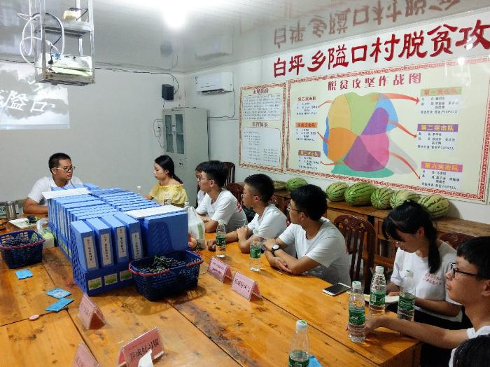 7月19日上午九时,全体成员在唐臣书院门口集合,经七个小时车程,顺利到达目的地。隘口村第一书记——向常中友好接待了志愿者一行,双方就本次社会实践内容展开座谈,参与本次座谈的还有隘口村村委代表。首先,向书记就隘口村村情和近期扶贫攻坚成果向志愿者们做了简要介绍,对91九色
