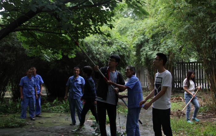 活动开始后,党员同志们在后勤保障处工作人员的指导下,清理了位于唐臣书院门口及后方的草丛,工作人员向大家演示了除草工具的正确使用方法,并不时叮嘱同学们注意防蚊虫,小心皮肤擦挂。党员干部们轻装上阵,拿起工具,在工作人员指导下悉心修建灌木丛,俯身除去地上的杂草。草地中央,有的为树木修剪多余的枝叶,有的用抓耙清理地上的落叶。大家还不忘发扬勤学好问精神,仔细向工作人选询问植被种植及维护相关问题。在党员同志们两个多小时的努力下,唐臣书院后方的环境焕然一新。