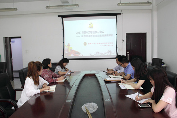 党总支组织教工第一党支部和学生第二党支部全体党员在犀浦校区X1306会议室召开学习会,专题学习了《关于新形势下党内政治生活的若干准则》、《中国共产党党内监督条例》,并专题研究部署了学院自查和党支部自查工作。学院党总支书记、副书记、党总支委员、学生党支部书记以及全体学生党员参加了会议。91九色
