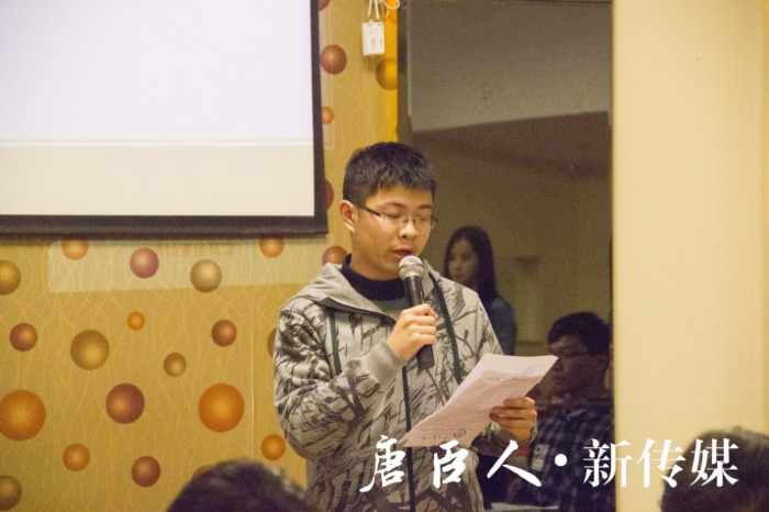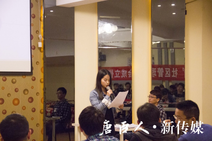 第二项,管理委员会主席吕洋介绍“唐臣书院”管理委员会的两个部门:书院事务部和书院自管部。他阐述管理委员会的主要任务时说:“管理委员会的主要任务是为服务学生为宗旨,我们要努力把书院建设得更好。”
