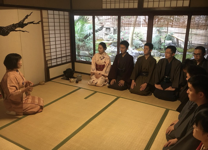 1月28日,访学团着日本和服学习传统茶道课程。和服的穿法较为复杂,男式和服以染有花纹的外褂和袴作为简易礼装,可以随意进行服装搭配。至于女式和服则更为复杂,色彩也较为艳丽。同学们换装结束后,学习日本茶道礼仪。日本茶道,即日本仪式化的、为客人奉茶之事。现在的日本茶道分为抹茶道与煎茶道两种,访学团体验的则是传统的抹茶道。茶道老师向同学们讲解了茶道的基本姿势,并解释了茶杯的使用方法,此外还奉上了精致甜美的和果子作为甜点。