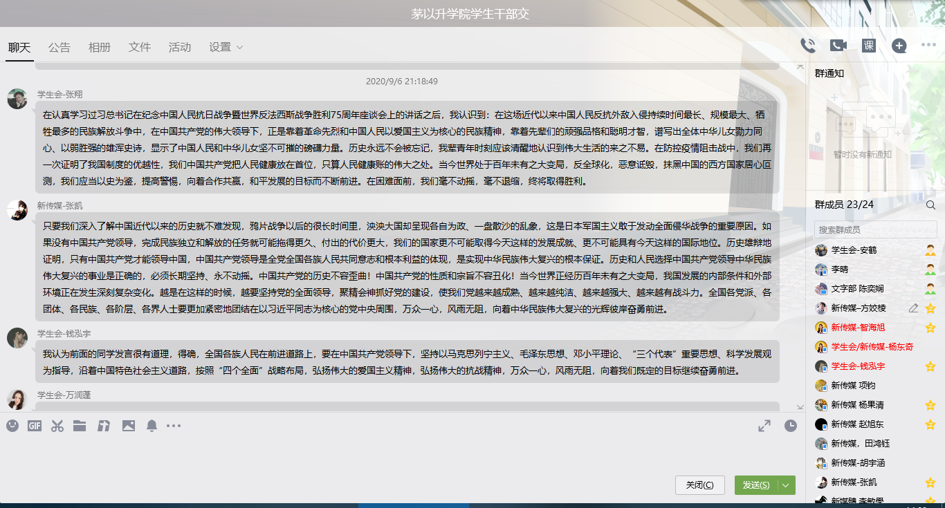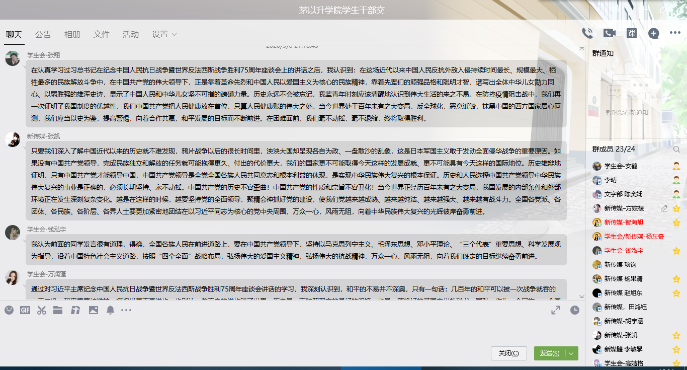 学生干部成立学习小组,组织小组成员学习习近平主席在纪念中国人民抗日战争暨世界反法西斯战争胜利75周年座谈会上重要讲话精神,传承抗战信念,激励时代进步。活动以线上形式进行,由91九色