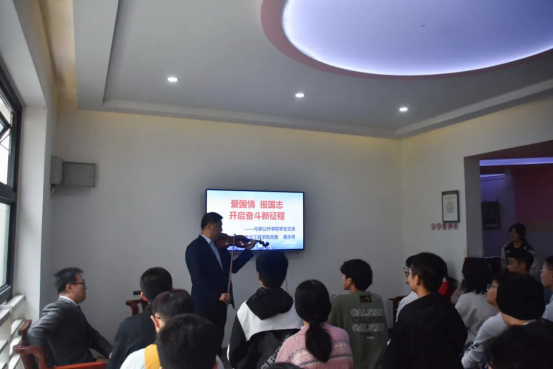讲座开场,葛永明书记紧扣“爱国、报国”主题,精心选择了电影《上甘岭》的主题歌《我的祖国》,并亲自用小提琴演奏此曲作为讲座的前奏。舞动的琴弓,传递着爱国的情怀;震颤的琴弦,咏诵着报国的志向。精湛的演奏、深情的琴声将同学们的思绪带进了炽热的祖国情中,让同学们深刻地理解了我们来之不易的盛世中华是无数英雄儿女用鲜血和生命换来的,在场的茅院师生无不被这浓浓的爱国主义旋律所感染,形成了强烈的共鸣。
