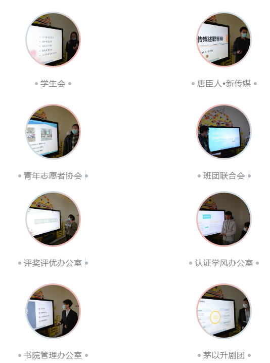 学生会、唐臣人•新传媒新闻网络工作室、青年志愿者协会、班团联合会、评奖评优办公室、认证学风办公室、书院管理办公室、茅以升剧团、卓尔舞团、唐臣文学社、奋斗科创社、桥之梦合唱团、大使团共计13个社团组织参与述职答辩,分别对本学期工作成果进行了汇报。