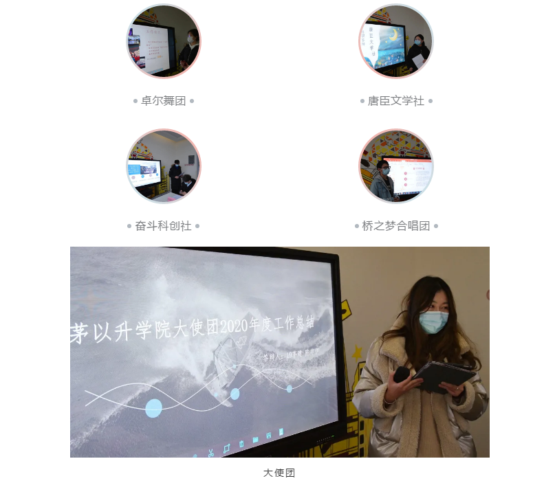 各个社团组织针对本学期各自工作概况就当前工作的成就以及存在的不足进行了陈述,就未来工作计划与安排进行了展望,详实地展示了茅院学子的风采,也表明了为大家服务的决心。