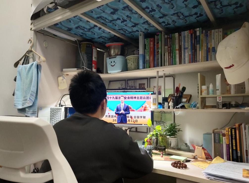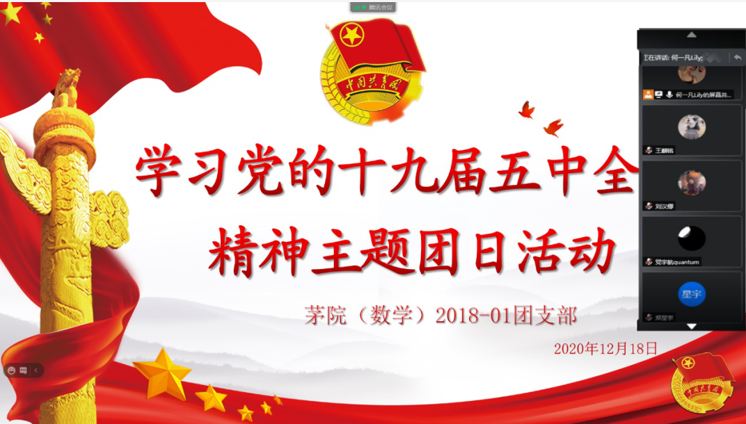 2020年12月15日上午,茅院(数学)2018-01团支部,为传达学习党的十九届五中全会精神,受疫情影响,同学们先在寝室进行自主学习,然后召开了交流学习党的十九届五中全会精神的线上会议。全班14名团员全部到齐。
