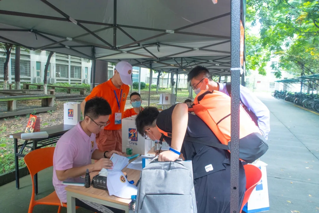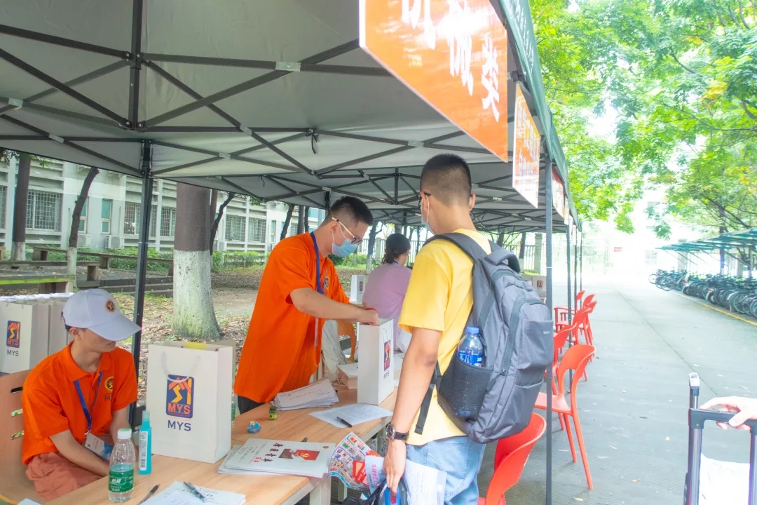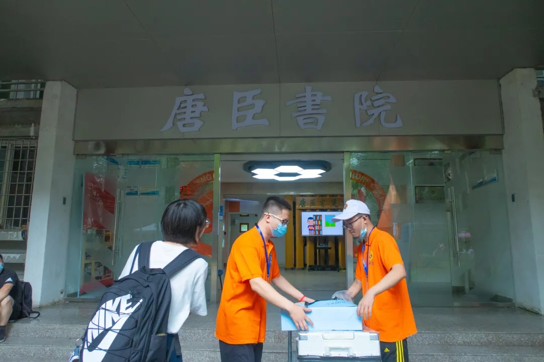 身着橙色院服的志愿者们在学校西门银杏大道迎新点引导新生来到唐臣书院,在书院门口等候多时的班导生们为同学们分发钥匙、水卡、新生大礼包以及代表茅院学子的唐臣文化衫。志愿者们穿梭于楼栋之中,搬运着一件件沉甸甸的“关爱”,挥洒汗水与热情。
