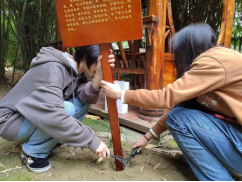 下午14:00,全体同学在书院楼下集合并将介绍牌搬到筑梦园中,接着就开始了热火朝天的劳动。甘霖书记以百年亭为例,给全体同学示范了如何把介绍牌立稳固。在书记的指导下,同学们分组行动,先在指定地点挖出10cm深的坑,填入水泥,把牌子放入后再浇水泥,并用一些石头固定,最后再把翻出来的土回填并敲实。很快,同学们在各自负责的亭子陆续完成了立牌,挖土、捡石头、浇水泥、填土等一系列操作。