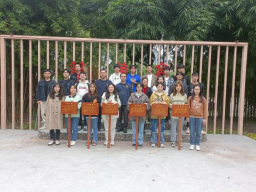 经过了两个小时的努力,同学们顺利给每个亭子都立好了介绍牌。从筑梦园入口处走进来,依次是“不负韶华”筑梦亭,“卓尔乐群”卓新亭,“力挽狂澜”百年亭,“自立自强”共青亭,“风烟俱静”沁心亭,“心路清朗”初心亭。介绍牌的颜色以及摆放的位置都很合适,仿佛与亭子融为了一体,十分赏心悦目。