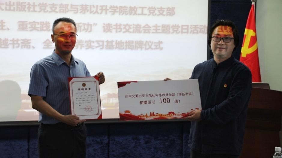 党总支书记甘霖、副书记王霞、综合管理办公室主任任凯利、组织员孟涵,以及出版社全体党员一起见证了卓越书斋的图书捐赠与全人培养实习基地的揭牌仪式。