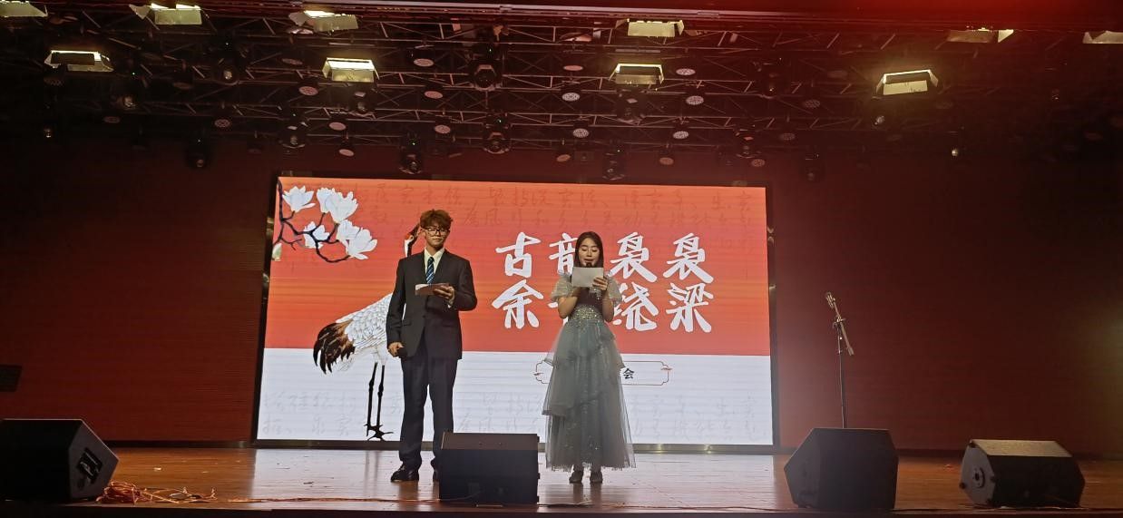 歌友们约定的时间到了,两位主持人身着盛装走上舞台,宣布晚会进入第一篇章——古音绕梁。