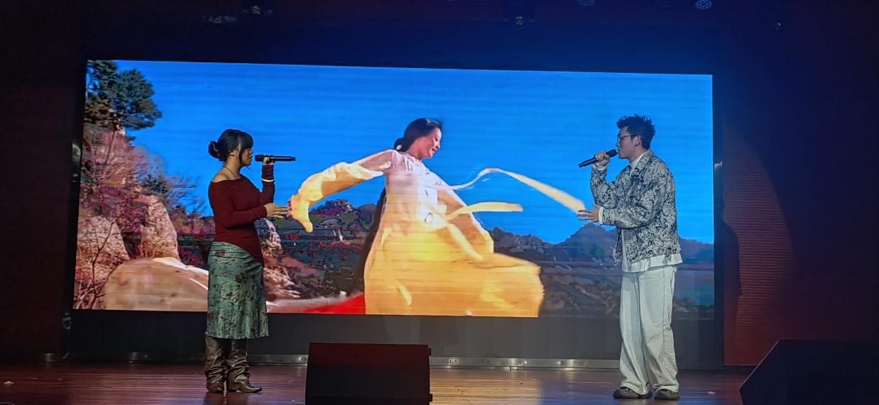 紧接着,由吴佳朔、依西措同学为我们带来了男女声二重唱《美丽的神话》。历经千年岁月的洗礼,神话以其独特的魅力,照亮了人类文明的发展之路,成为了文化传承、精神信仰、艺术表现的重要体现。万世沧桑、悲欢岁月唯有爱是永远的神话;潮起潮落始终不毁真爱的相约,仿佛让我们回到了那个荡气回肠的古典爱情故事中,体会到了穿越千年的爱恋!