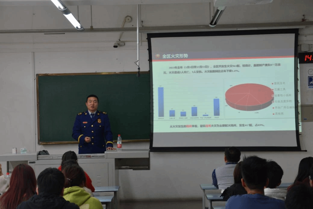 本次讲座主题为“守牢校园消防安全管理底线”。董副大队长首先与同学们分享自己的经历,以消防员的视角为同学们传授经验,随后将视距拉长,从小到大,从郫都区乃至全国范围详细为同学们分析了近年来火灾发生的具体情况和原因,特别是结合近期南京市雨花台区居民楼的火灾事故,让同学们深刻体会到消防隐患离我们的生活其实并不遥远,而那些看似小小的不规范就可能导致不可挽回的后果。