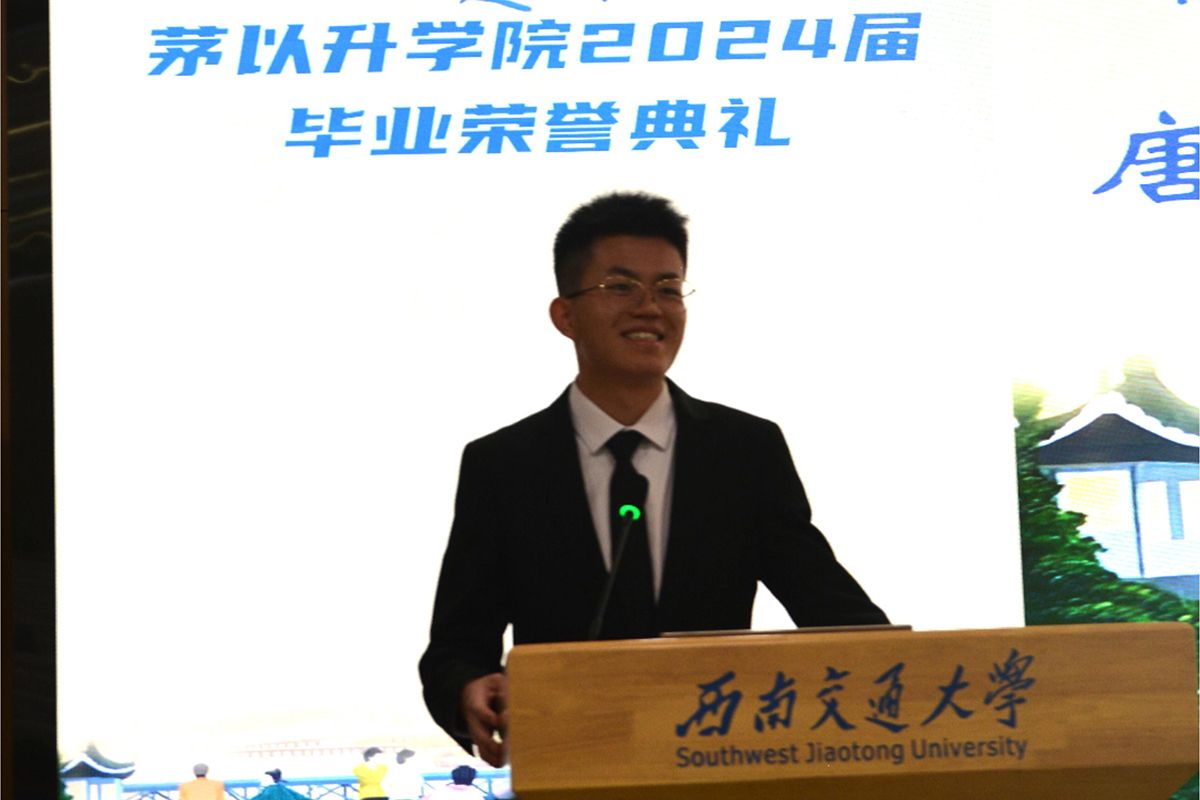 2024届优秀毕业生代表、唐臣奖章获得者、土木工程专业王晓波同学分享毕业感言。王晓波同学从大一的学习生活开始讲述,《高等数学》《大学物理》往日的种种历历在目,四年的学习生涯,组成的是青春,是抹不去的见证。“相伴一程,亦是欢喜”,对所有“欢笑与压力并行,却依旧乘风破浪,一路走来”的同学,给到了最真诚的祝福。