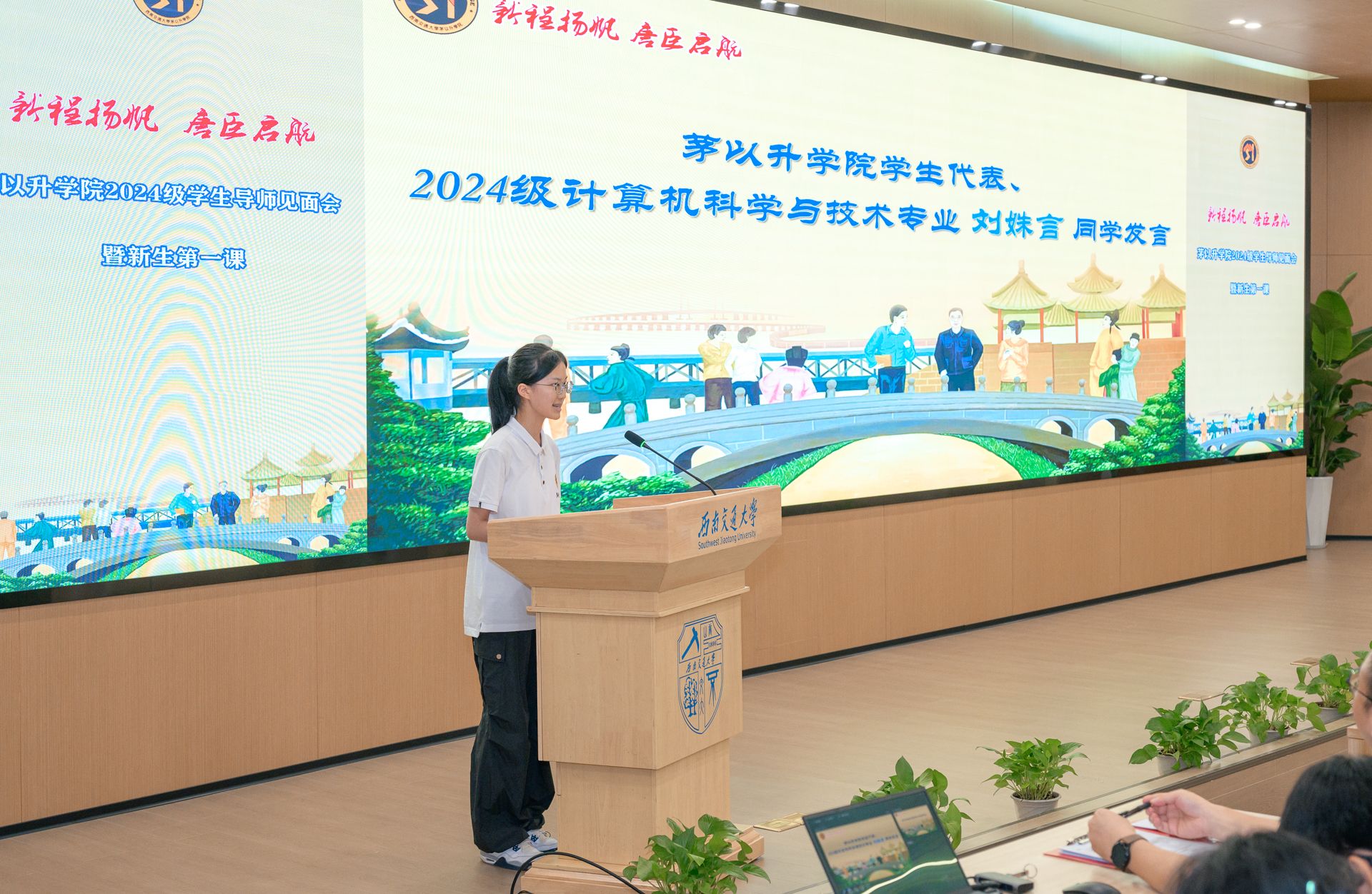 2024级计算机科学与技术专业茅班刘姝言同学作为学生代表发言。她号召全体同学以茅以升先生为榜样,以发展科学为目标,躬行实践,探索真理,努力成长为有能力、有担当的时代新人。