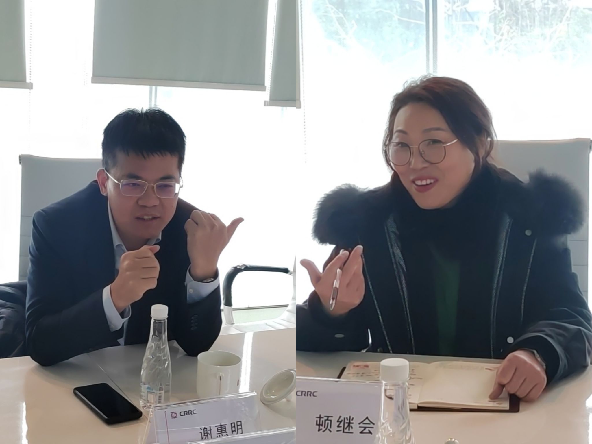 参观学习结束后,在中车机车展馆会议室,中车科技园成都公司谢惠明、顿继会、夏爽与我校师生交流,围绕“校企合作共促发展”等主题,开展专题研讨,分享经验与思考。