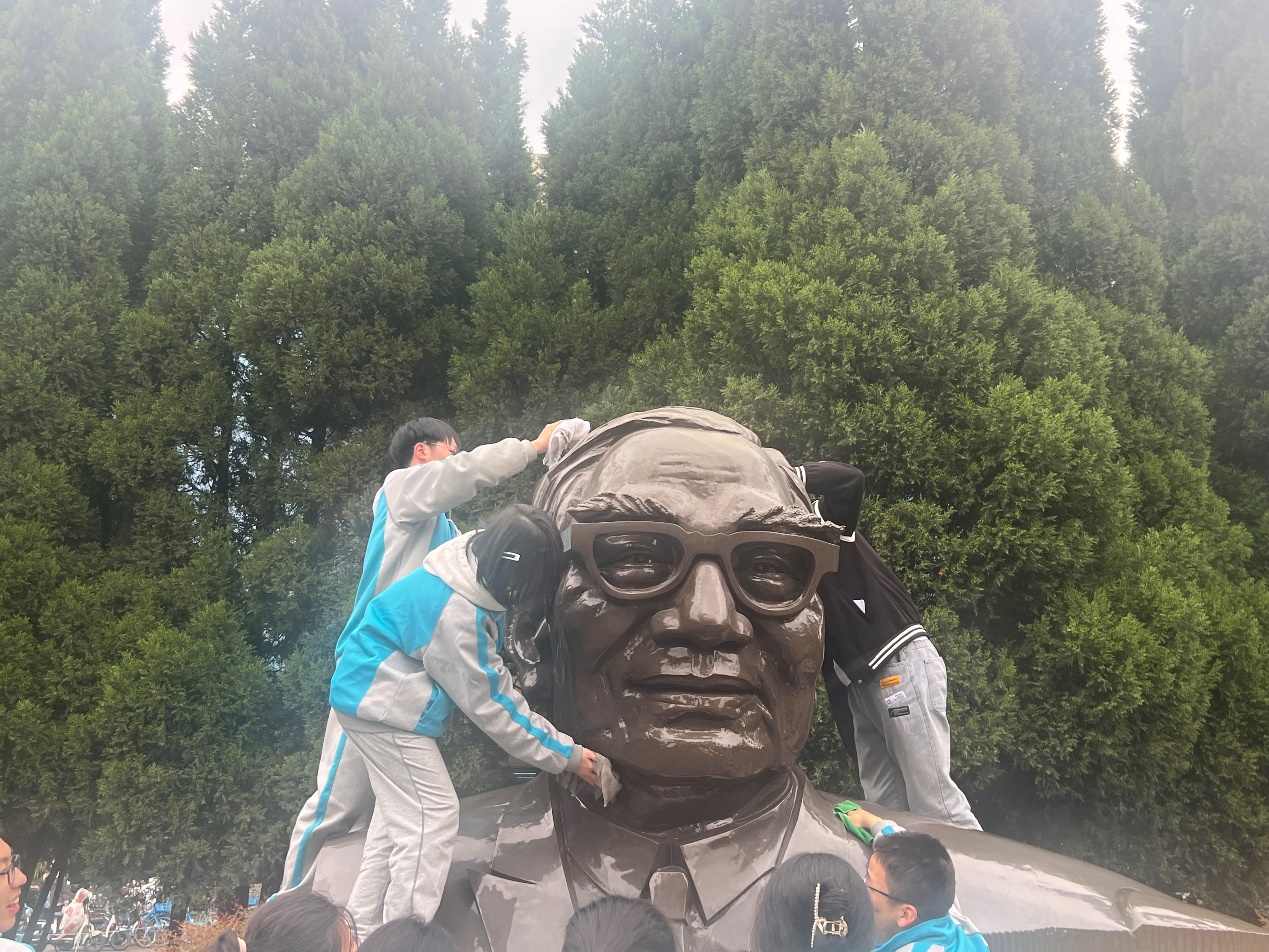 活动在肃穆的氛围中拉开帷幕。师生们手持毛巾,擦拭清理着茅以升先生雕像每一处纹路的污渍。从茅老凝视远方的眉眼,到长衫褶皱间的岁月留痕,直至镌刻着“爱国知识分子的楷模——茅以升”的汉白玉基座……他们小心翼翼,认真细致,以最质朴的方式表达对先辈的崇高敬仰。清洁不仅是仪式,更是精神的洗涤。拭去的是尘埃,唤醒的是记忆,双手与雕像的触碰,正是时空之上的一次精神对话。