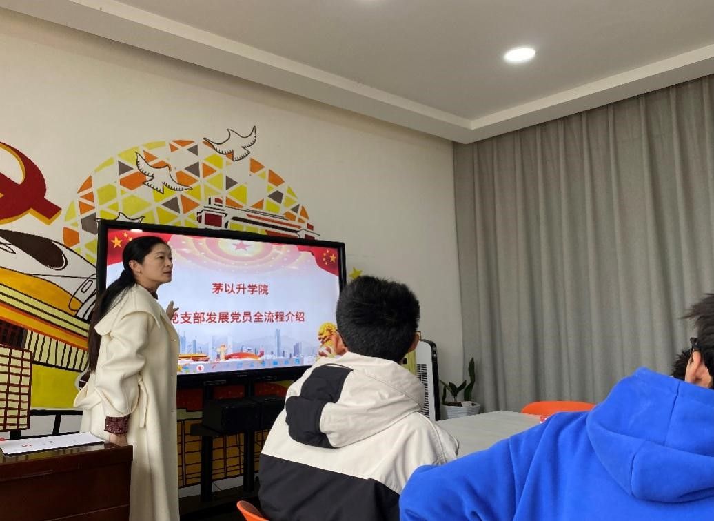 孟老师分别从入党积极分子的确定和培养教育;发展对象的确定和考察;预备党员的接收;预备党员的教育、考察和转正四个方面进行了详细讲解。孟老师同时强调要把握党员发展过程中的重要时间节点以及保证提交材料的格式正确,以确保后续发展。
